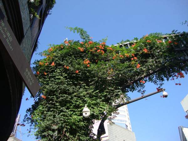 在用鋼構(gòu)件制作成的圓柱周邊,種上幾株凌霄,加強(qiáng)水肥管理,三、兩年就可爬滿圓柱,花開(kāi)時(shí)節(jié),滿柱紅花,給人以賞心悅目之感。