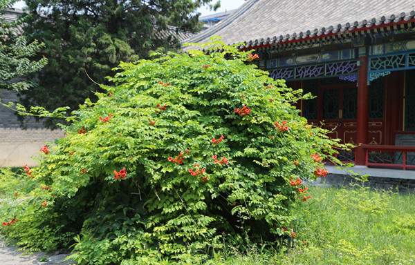 凌霄具有較強(qiáng)的攀援能力,將其栽植于建筑物的西山墻,幾年時(shí)間,便可爬滿墻體,不僅起到了綠化美化作用,還可有效降低夏季的室溫。花開(kāi)之時(shí),滿墻紅花,好似花瀑一般,隨風(fēng)搖曳,美輪美奐。
